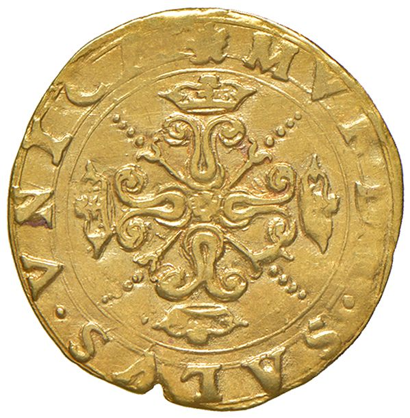 Scudo d'oro del sole, con stemma e croce con corone. Crippa 6/B. MIR 303/2. ORO, gr. 3,29. Rarissimo. Bel BB
