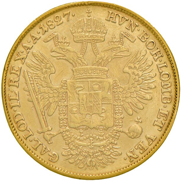 Sovrana 1827. Crippa 1/F. MIR 500/6. ORO, gr. 11,24. Rara. Lucidatura sul D/. MB/BBBase d'asta