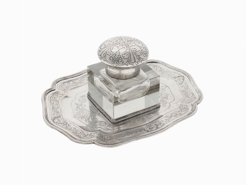 CALAMAIO IN CRISTALLO CON VASSOIO IN ARGENTO, ITALIA, FINE SEC.XIX Calamaio in cristallo con tappo in argento, su vassoio sagomato in argento a fondo inciso, Punzone fine ¿800 per Fiori. (gravi danni al cristallo). Peso g 550,00 + tappo boccetta g 100,00 cm. 28,00 x 22,00. AN ITALIAN SILVER AND CRYSTAL INKSTAND, ITALIA, END XIX CENTURYStima