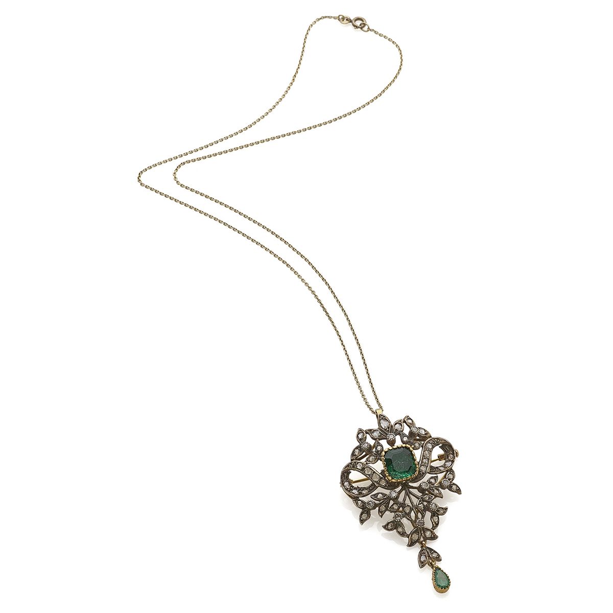 fine catenina in oro che trattiene pendente/spilla in oro e argento, decorato al centro da smeraldo taglio ottagonale, motivi fogliacei ornati da diamanti taglio rosetta e frammenti terminante con smeraldo taglio a goccia.