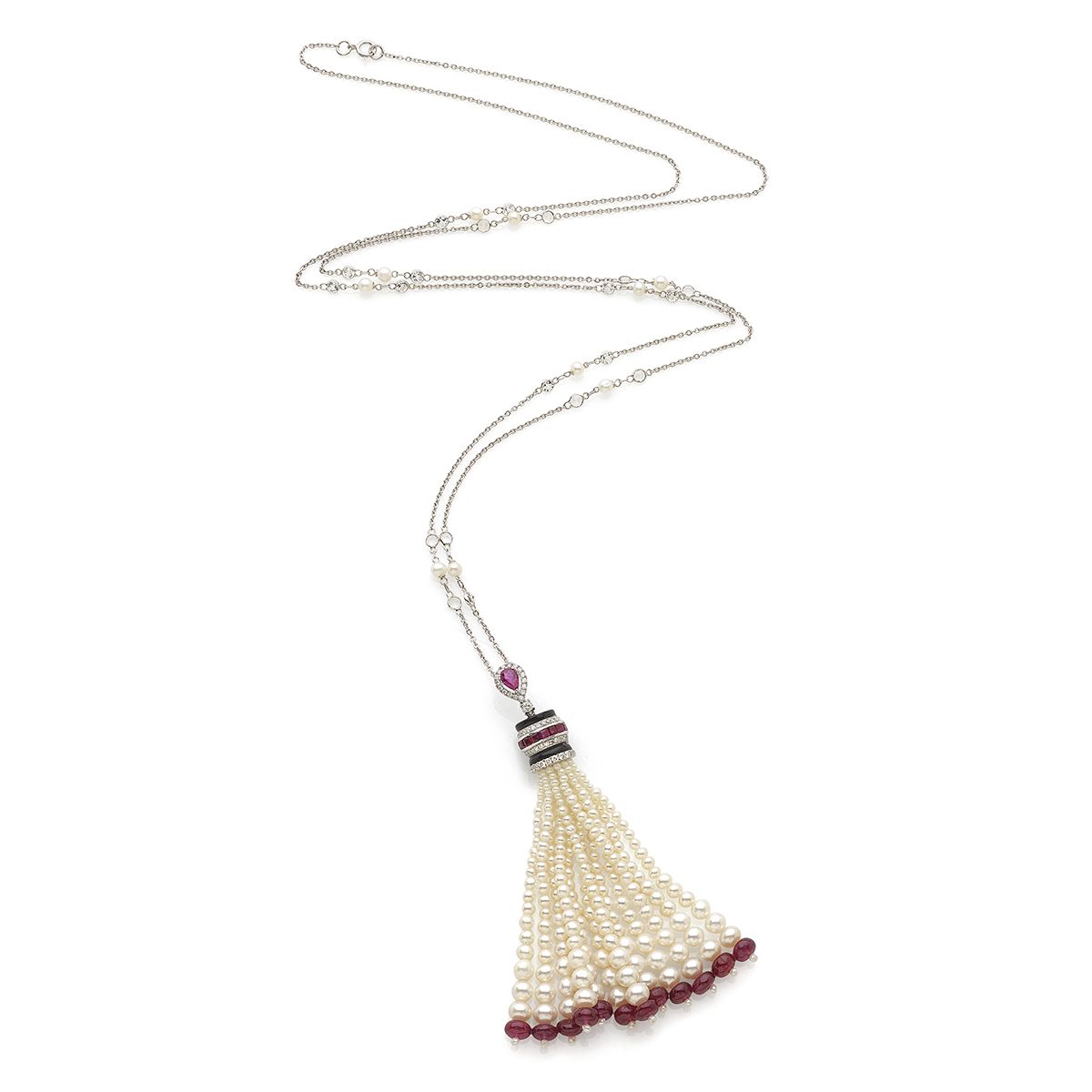 WHITE GOLD 18K NECKLACE WITH PENDANT, WITH PEARLS, DIAMONDS, RUBIES AND ONIX