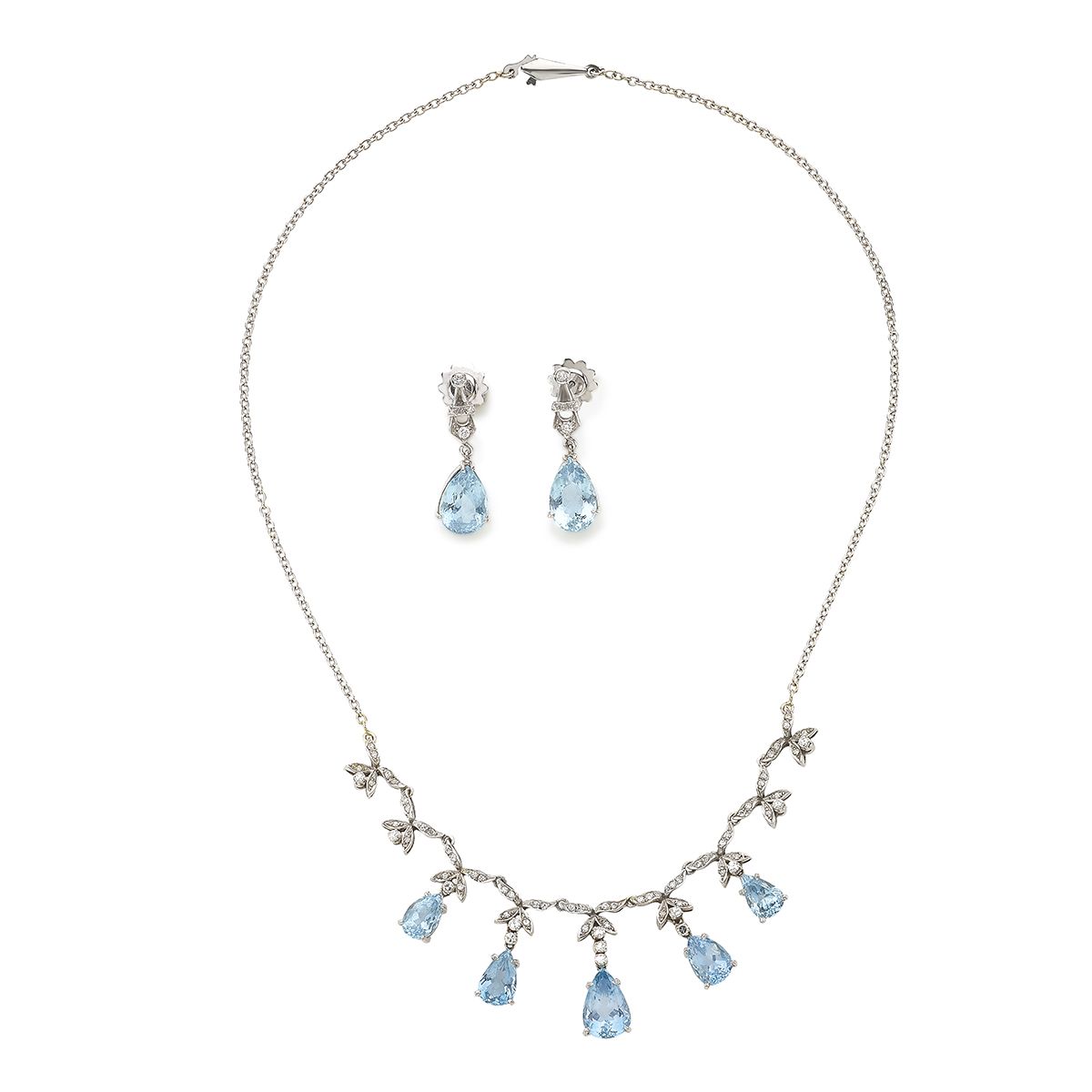 WHITE GOLD 18K NECKLACE AND EARRINGS, WITH AQUAMARINES AND DIAMONDS