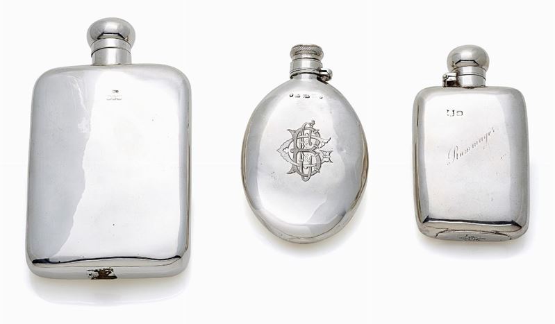 composto da tre fiaschette in argento di forme edimensioni diverse, a corpo liscio; Punzoni ed epoche diverse.Peso complessivo g 349,00