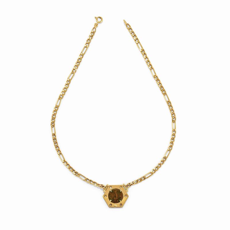 maglia a catena con centrale esagonale e moneta, contorno in pietre incolori (ad imitazione del diamante).