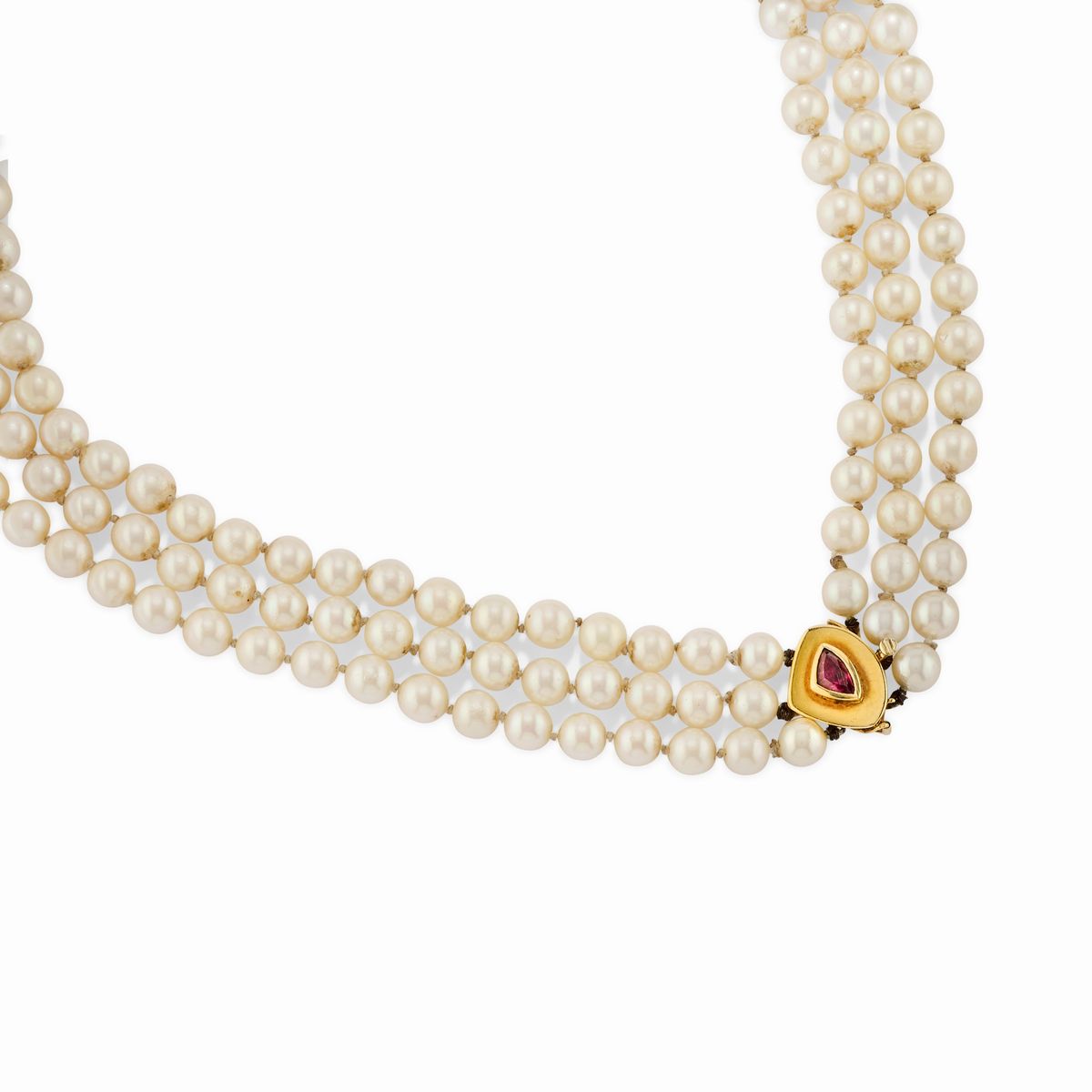 collana a tre fili di perle coltivate di mm 8,00 circa con chiusura impreziosita da rubino taglio scudo e coppia di orecchini con rubini taglio goccia e contorno in diamanti taglio huit-huit, chiusura perno e clip.