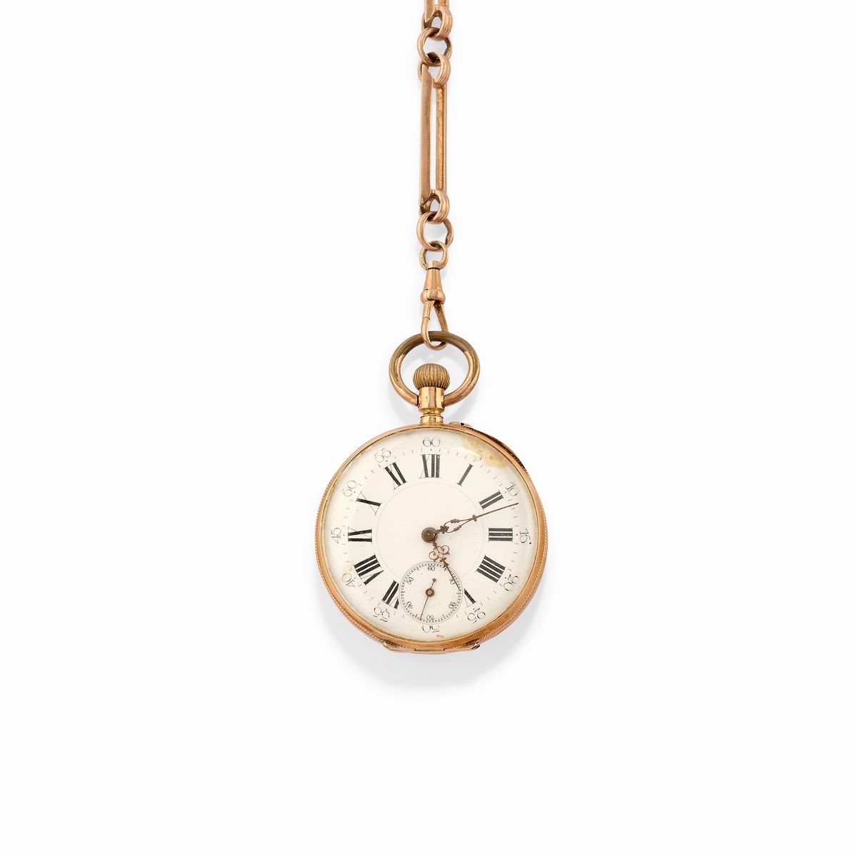 casse rotonde, quadranti chiari con numeri romani in smalto nero, uno con secondi al sei, movimenti a carica manuale, catene in oro bassa caratura, difetti (segni d'usura su un quadrante, da revisionare).