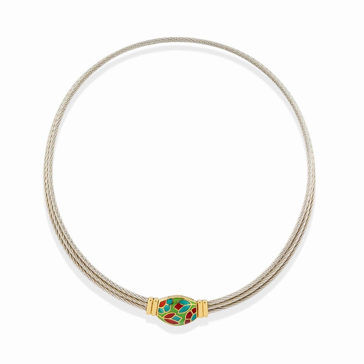 composta da collana con centrale in smalto policromo, bracciale, anello e coppia di orecchini con chiusura a clip.
