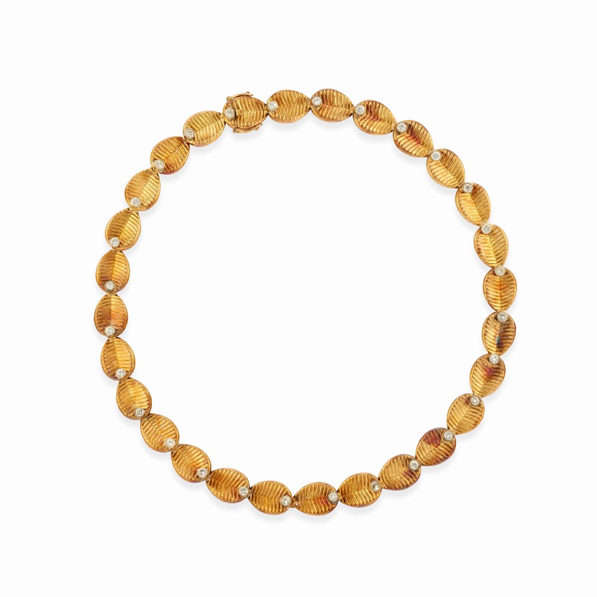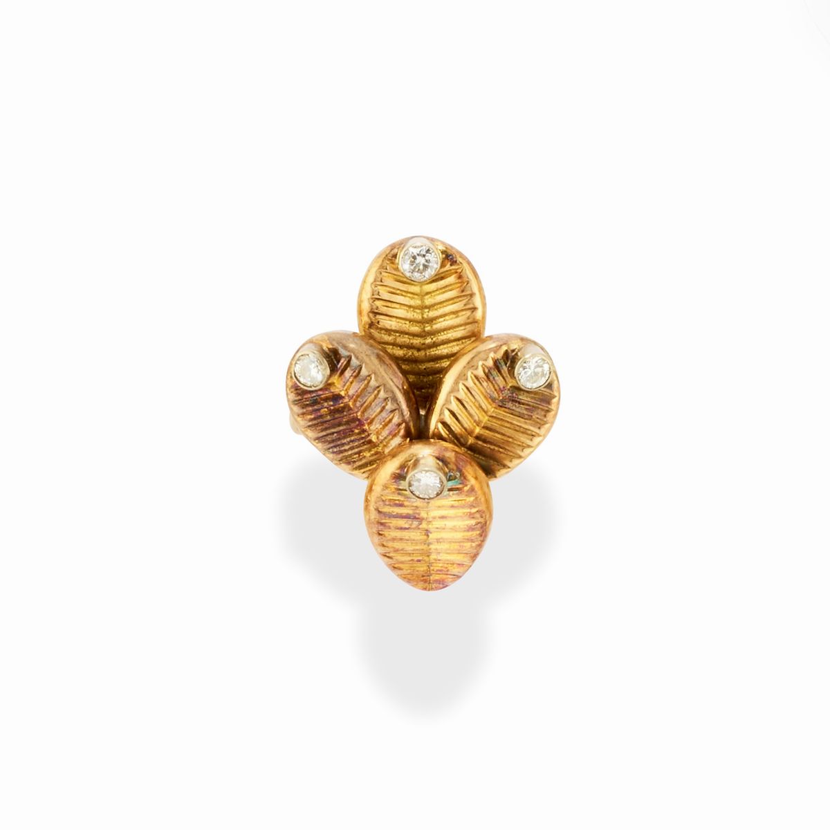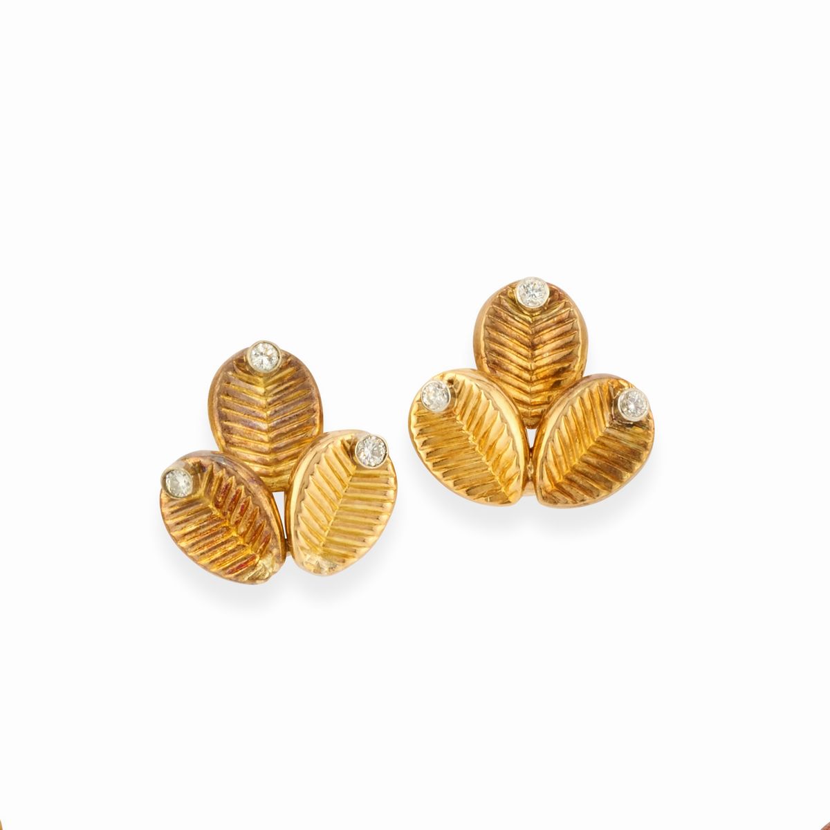 composta da orecchini con chiusura a clip, anello, bracciale e collana con motivi a foglie incise, diamanti taglio brillante per totale ct 5,00 circa, un orecchino reca firma Cartier, difetti (piccole ammaccature)