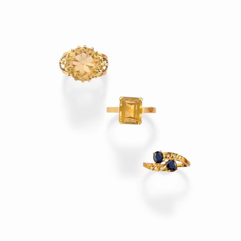 due con quarzi taglio rettangolare e ovale, uno con zaffiri taglio ovale e diamanti taglio huit-huit.