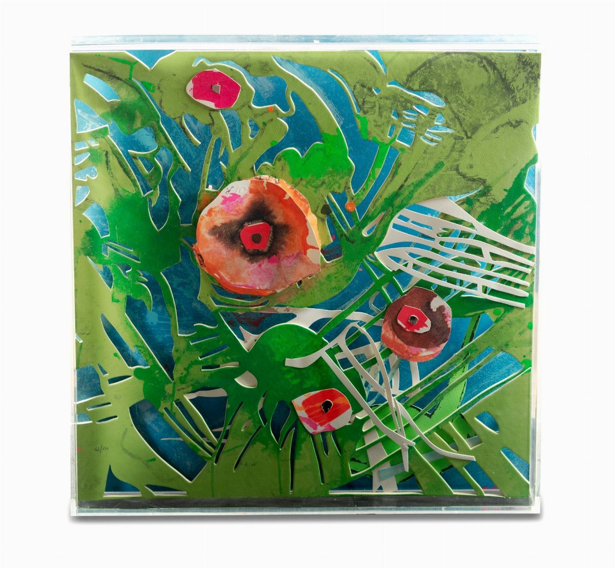 serigrafia a colori su collage di carta e cartone sagomati applicati su masonite, entro plexiglass,