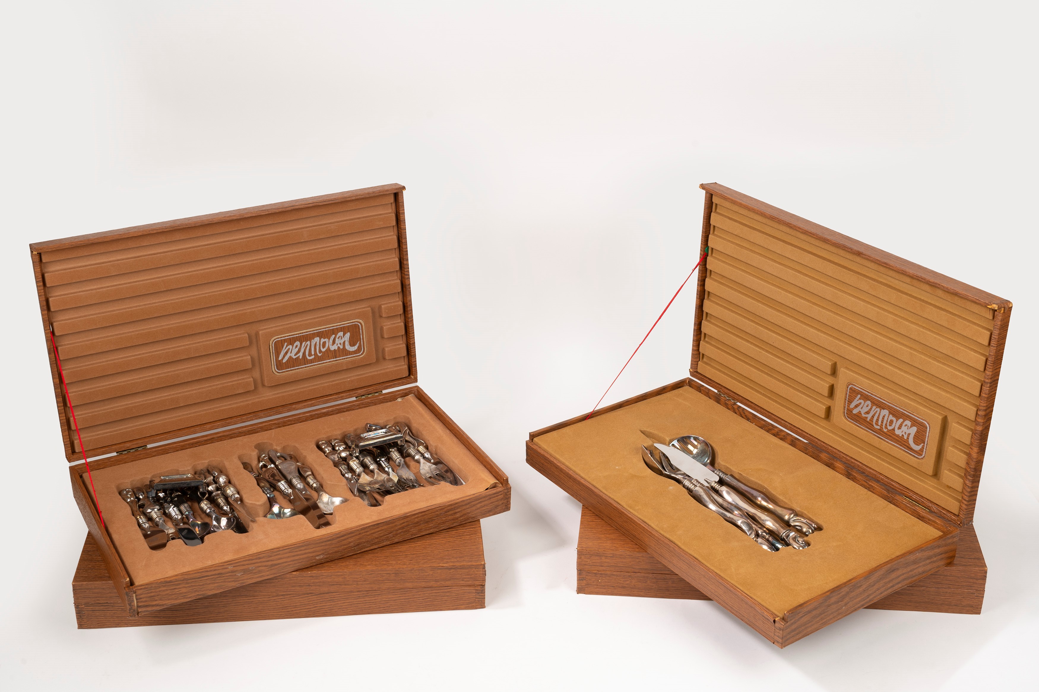 4 scatole originali contenenti 54 posate da tavola, 4 da portata e 6 poggia posate