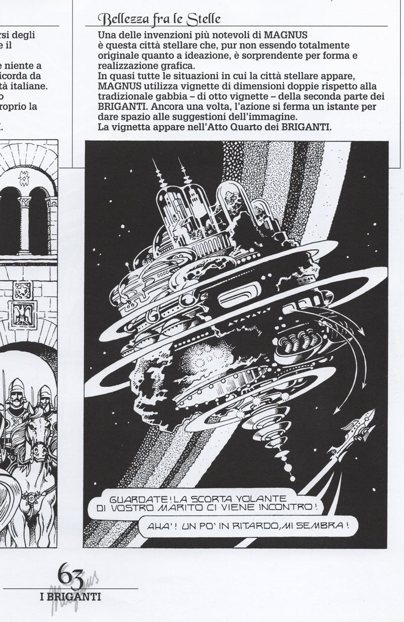 Tavola originale realizzata da Magnus per "Governanti e rivali" contenuta nell'Atto IV de I Briganti a pag. 19 e pubblicata per la prima volta a episodi sulla rivista Comic Art nel 1989. Un'opera che accompagna il maestro bolognese lungo la maggior parte della sua carriera, dal 1973 fino alla sua scomparsa, facendo si che lo stile grafico cambi nel tempo seguendo la sua evoluzione stilistica. Ispirandosi ad un romanzo cinese del XIII secolo, Magnus sviluppa il racconto in maniera fantascientifica: si ispira a Flash Gordon e a Saturno contro la terra, passa dal medioevo futuro alle astronavi spaziali, in una ambientazione esotica e fiabesca mescola elementi realistici e tecnologici, unisce Oriente e Occidente.