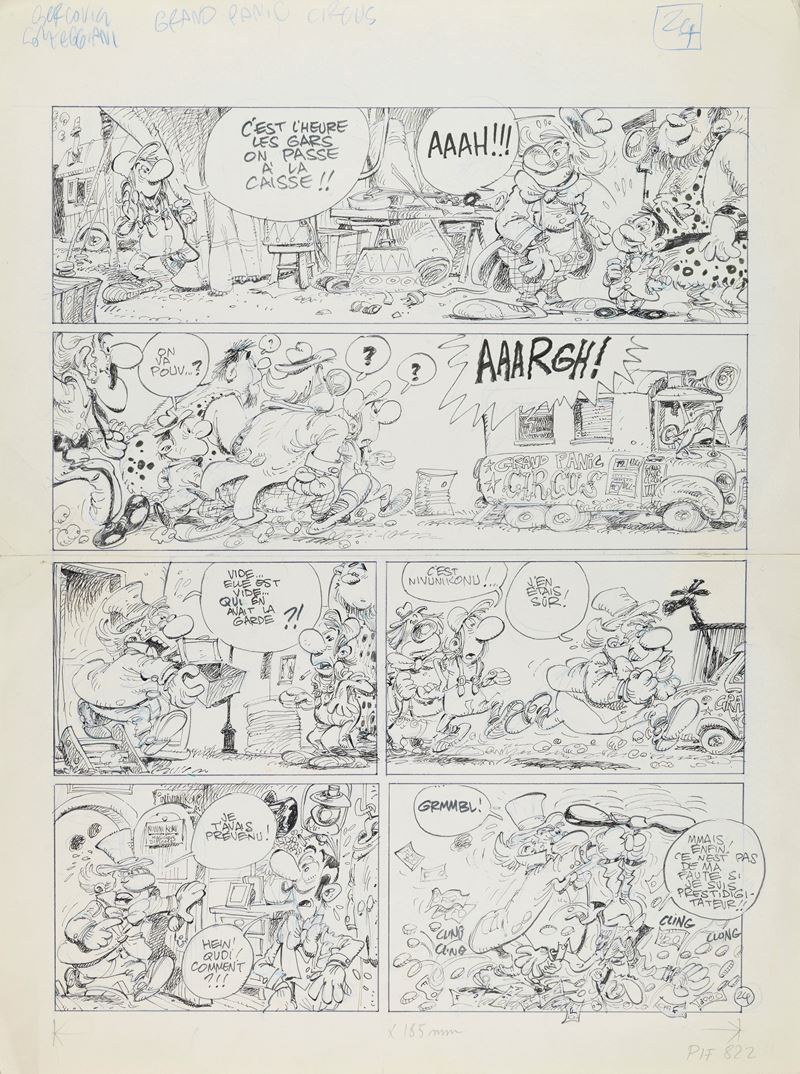 Tavola originale realizzata da Bercovici per la pag. 24 di un'avventura della serie "Grand panic circus", edita in Francia sulle pagine della rivista Pif n. 822 nel 1984. Su due pannelli. Lievi pieghe ai margini.
