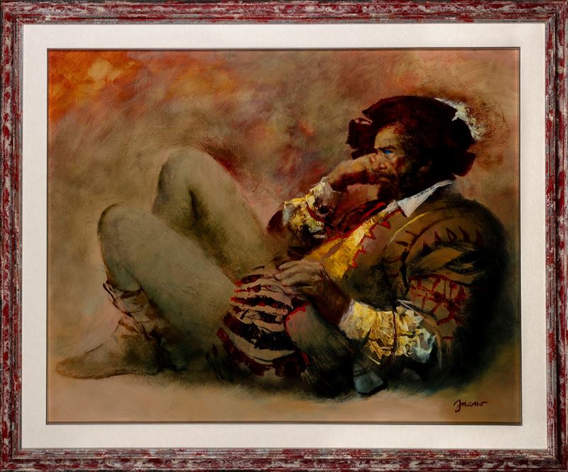 Dipinto originale realizzato da Jacono facente parte della serie dei suoi guerrieri dagli occhi azzurri. Durante i primi anni '70 Jacono si cimentò con successo in una serie di mostre pittoriche che lo connotarono immediatamente quale artista figurativo puro. In questo momento, tra i tanti soggetti che gli diedero fama anche in campo pittorico, nascono i suoi guerrieri, possenti combattenti che con i loro occhi azzurri scrutano l'osservatore e gli rimandano una sensazione di forza pacifica e di tranquillità interiore, più vicina al codice del Bushido che al codice cavalleresco. In cornice. Firmato.