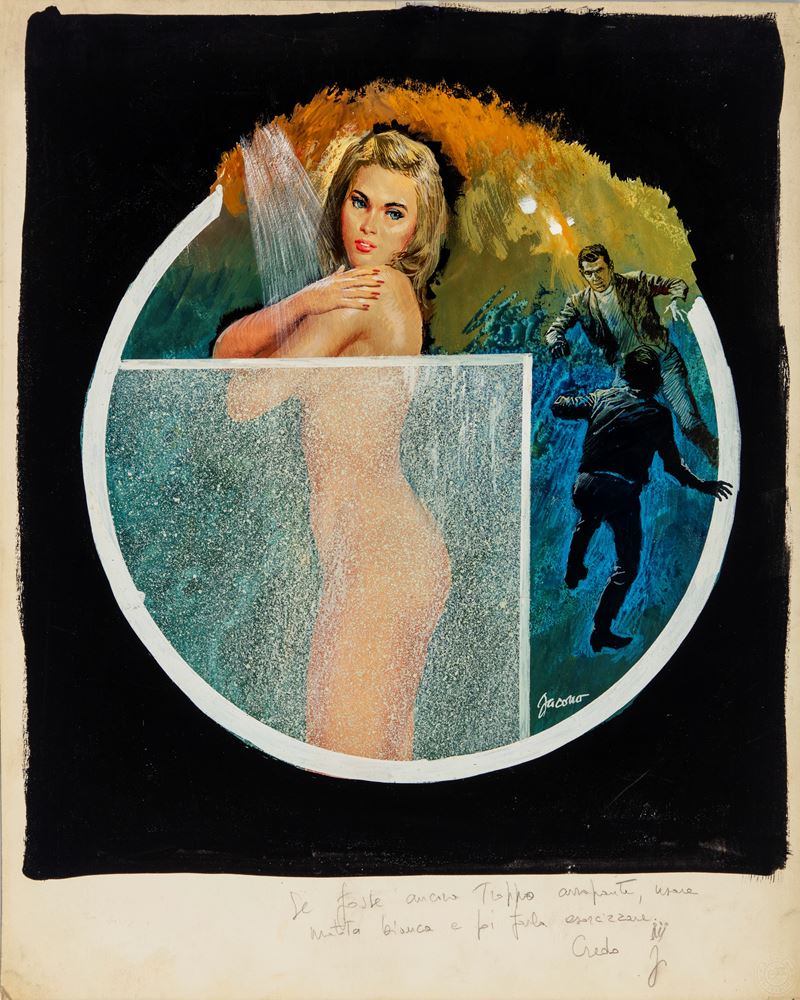 Originale di copertina realizzato da Jacono per "OS 117: qua la mano, Sagarra" di Josette Bruce, edito nella celebre collana Segretissimo n. 456 dalla Mondadori nel 1972. Fori di affissione ai margini. Firmato.