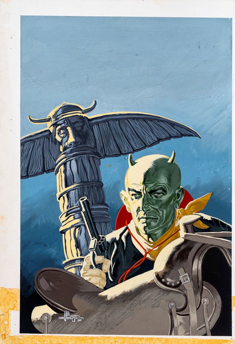 Originale di copertina realizzato da Uberti per "La caverna Misteriosa", edito su Gli albi di Kinowa n. 46 dalla Editrice Dardo nel 1966. Fori di affissione ai margini. Firmato.