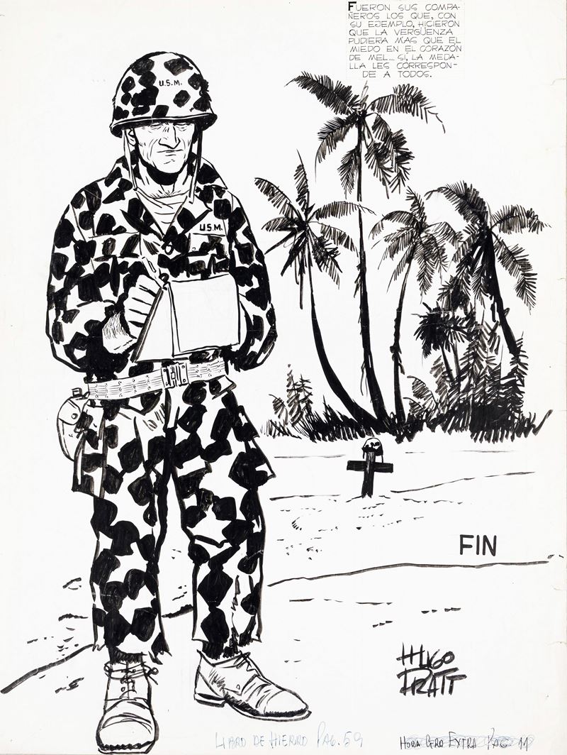 Tavola originale realizzata da Pratt per la pag. 8 di "Tarawa", episodio di Ernie Pike edito per la prima volta in argentina su Hora Cero Extra n. 1 nel 1958. Opera pubblicata nella pagina editoriale della rivista Sgt. Kirk n. 35 nel 1974. Ispirandosi alle storie del corrispondente di guerra americano Ernie Pyle, morto sul finire del secondo conflitto mondiale su di un’isoletta del Pacifico, mentre era al seguito della 77a Divisione di Fanteria USA, Oesterheld e Pratt crearono nel 1957, in Argentina, il personaggio di Ernie Pike, un uomo abituato agli orrori della guerra, ma non per questo arreso alla sua sanguinaria idiozia. Testi di H.G. Oesterheld. Lievi pieghe e piccoli strappi al margine destro. Firmata.