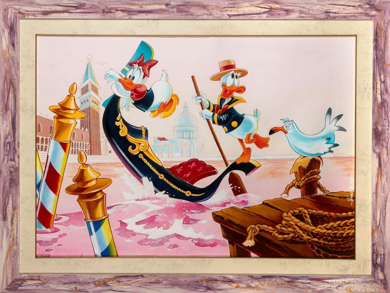 Dipinto originale realizzato dalla Molinari negli anni 2000, un'opera di grande formato che denota l‘incredibile capacità tecnica di questa autrice e il suo amore per il mondo dei paperi. In cornice. Firmato.