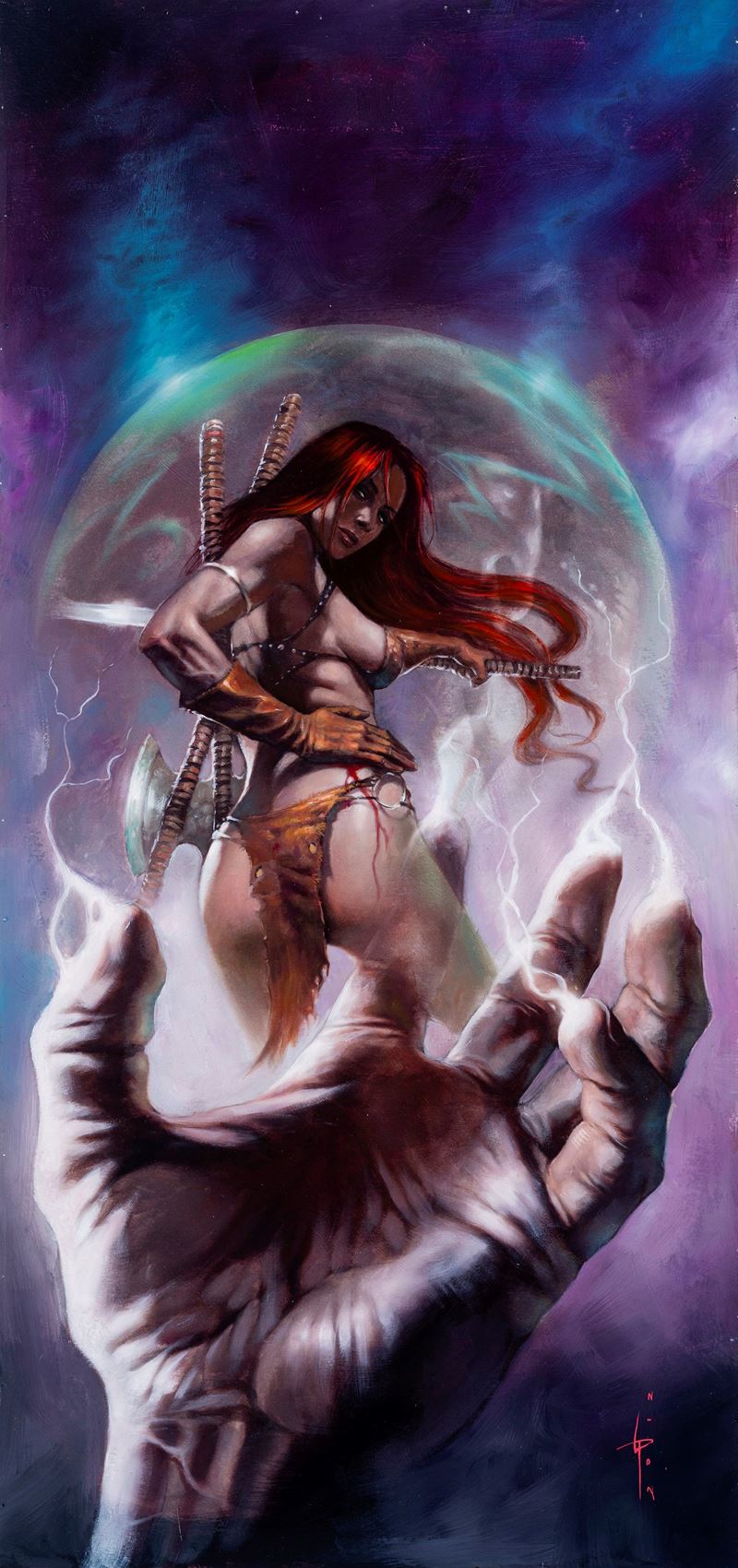 Originale di copertina realizzato da Parrillo per "Red Sonja: Atlantis Rises" n. 4, edito dalla Dynamite Entertainment nel 2012. Fori di affissione ai margini. Firmato e datato al fronte e al retro.