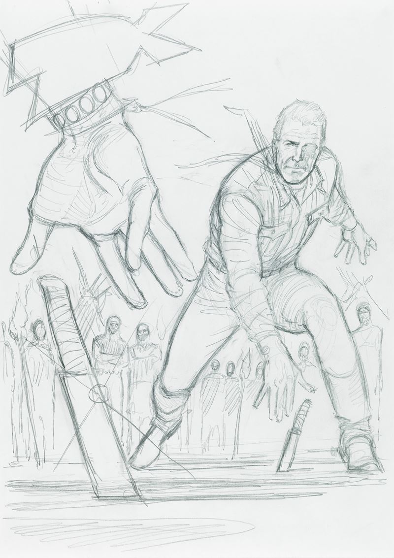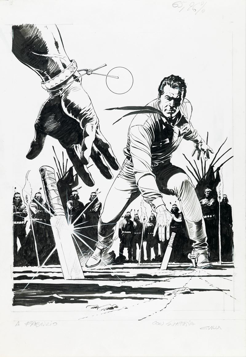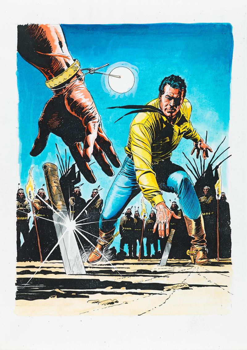 Originale di copertina realizzato da Villa per "Tumak l'inesorabile", edito su Tex n. 536 dalla Bonelli nel 2005. Si allega il preliminare a matita su carta (21 x 29,5 cm) e il definitivo ad acquerello su fotocopia (21 x 29,5 cm). Firmato e dedicato.