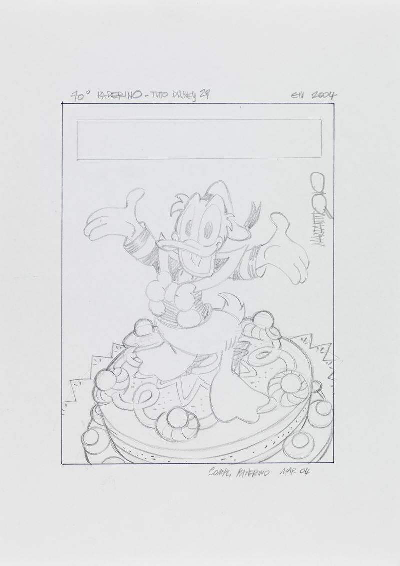 Preliminare di copertina realizzato da Mastantuono per "70° Paperino", edito su Tutto Disney n. 29 nel 2004. Firmato e datato.