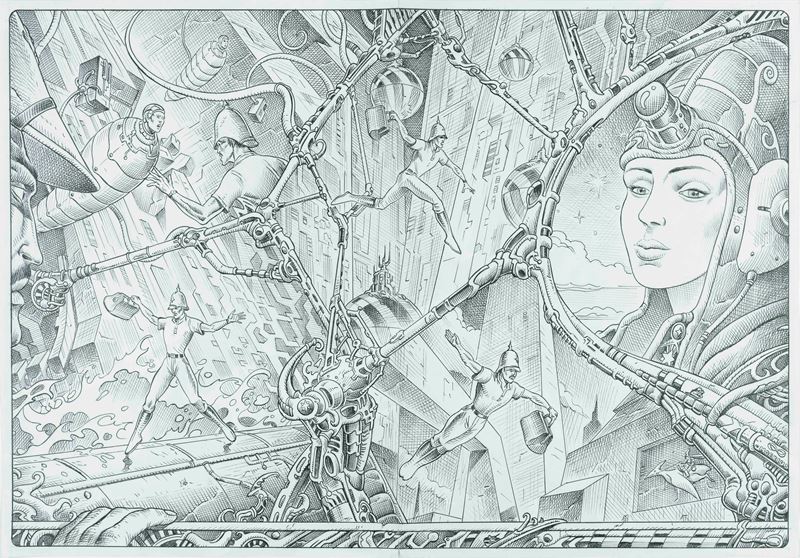 Illustrazione originale realizzata da Comolo come omaggio all'arte visionaria di Moebius. Un'opera poderosa degna del talentuoso maestro di Varallo Sesia, ormai sempre più dedito ad omaggiare i grandi maestri della nona arte. Si accompagna il disegno preliminare a matita e china su carta (58,5 x 40,5 cm). Firmata e datata.
