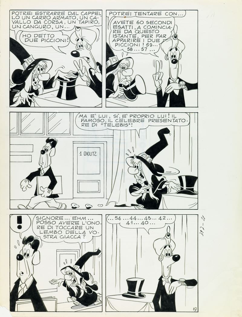 Tavola originale realizzata da Asteriti per "Zio Paperone e il telescrocco", edita su Topolino n. 397 a pag. 19 nel luglio 1963. Pieghe all'angolo inferiore destro e piccola mancanza all'angolo inferiore sinistro.