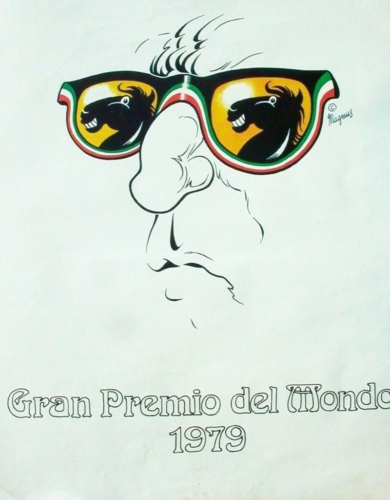 Illustrazione originale realizzata da Magnus per il celebre poster "Gran Premio del Mondo 1979", raffigurante uno splendido ritratto di Enzo Ferrari. Lievi pieghe al margine inferiore. Firmata.
