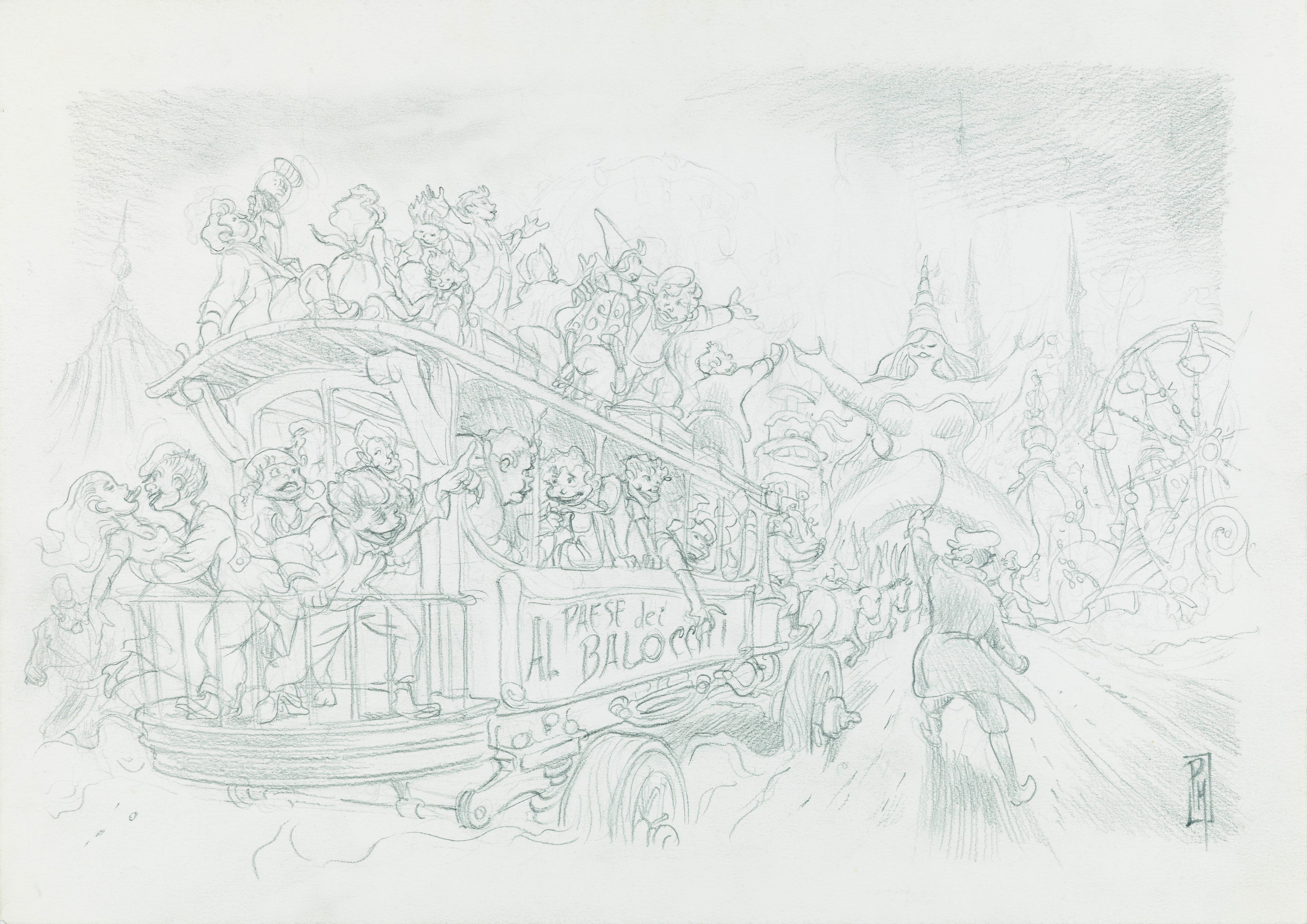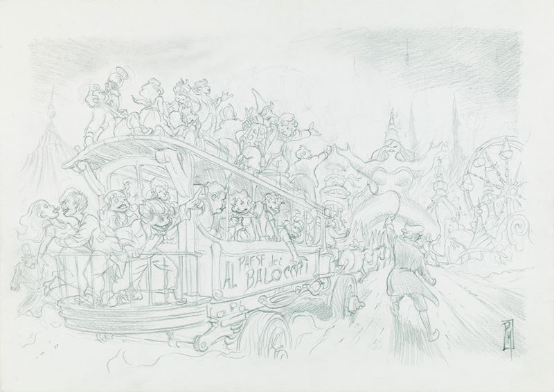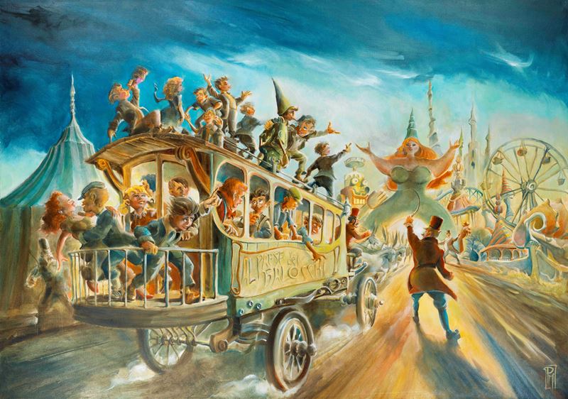 Dipinto originale realizzato da Mottura per "Pinocchio: illustrato da Paolo Mottura", la sua personalissima trasposizione grafica del classico di Collodi edita dalle Edizioni NPE nel 2022. Si allega il disegno preliminare a matita (42 x 30 cm). Firmato.