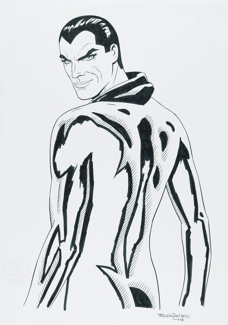 Illustrazione originale realizzata da Zaniboni nel 2008 raffigurante Diabolik. Grafico pubblicitario e illustratore, approda al fumetto nel 1967 ed entra nel 1969 nello staff di "Diabolik". Da allora ha realizzato oltre 300 avventure e centinaia di copertine, nonché i ritratti femminili al retrocopertina, contribuendo allo svecchiamento grafico del personaggio. Dai primi anni 2000 Zaniboni ha ripreso la sua attività di pittore, realizzando grandi tele a soggetto diaboliko, apprezzate ed esposte in tutto il mondo. Lievi pieghe ai margini. Firmato e datato.