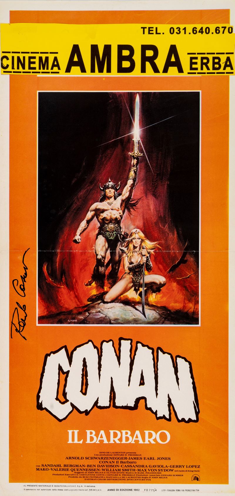 Locandina originale in prima edizione del film "Conan il barbaro", diretto da John Milius con Arnold Schwarzenegger e James Earl Jones nel 1982. Presenza di difetti. Firmata da Casaro.