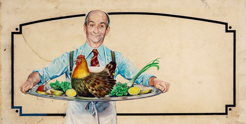 Bozzetto originale realizzato da Casaro per la locandina ufficiale del film "L'ala o la coscia?" diretto da Claude Zidi con Louis de Funès e Coluche nel 1976. Lieve odulatura della carta.