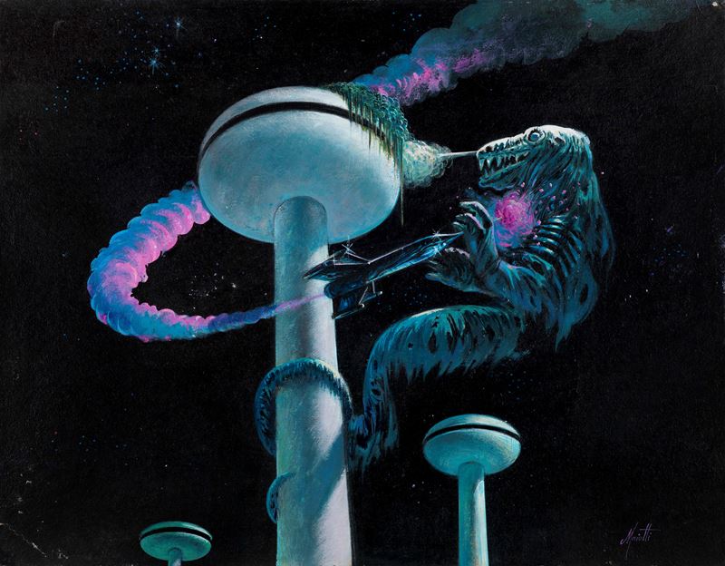 Illustrazione originale realizzata da Maiotti per la Grande Enciclopedia della Fantascienza, edita dall’Editoriale Del Drago nel 1980-81. Lieve piega all'angolo inferiore sinistro e superiore destro. Firmata.