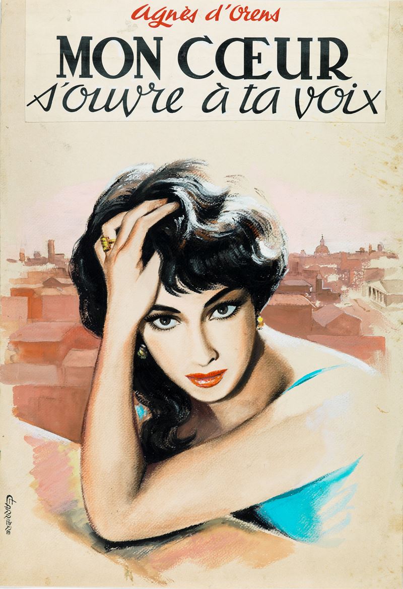 Originale di copertina realizzato da Carrière per il romanzo "Mon coeur: s'ouvre à ta voix" di Agnès D'Orens, edito da Remparts nel 1962. Lievi pieghe e piccoli strappi agli angoli. Firmato.