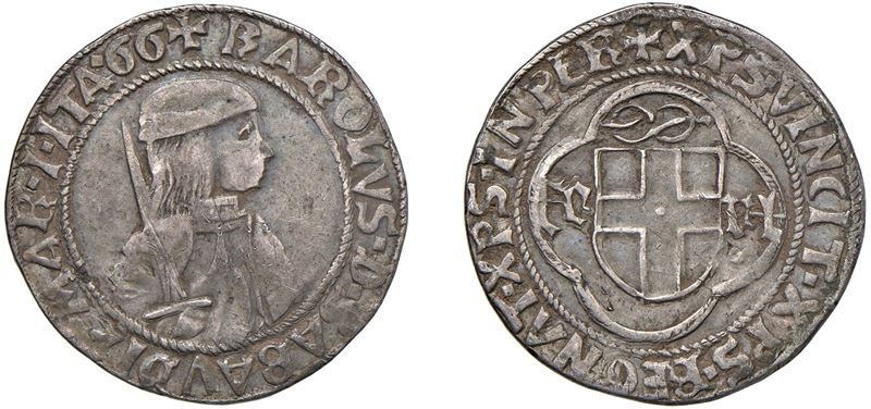 Dritto: Busto corazzato volto a destra, con berretto e lunga spada impugnata obliquamente nella mano destra. In legenda sigle GG (Nicola Gatti, maestro di zecca); - Rovescio: Stemma sabaudo accostato da FE – RT e sormontato da nodo d’amore, il tutto entro cornice quadrilobata.