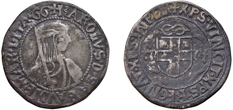 Dritto: Busto corazzato volto a destra, con berretto e lunga spada impugnata obliquamente nella mano destra. In legenda sigle GG (Nicola Gatti, maestro di zecca); - Rovescio: Stemma sabaudo accostato da FE – RT e sormontato da nodo d’amore, il tutto entro cornice quadrilobata.