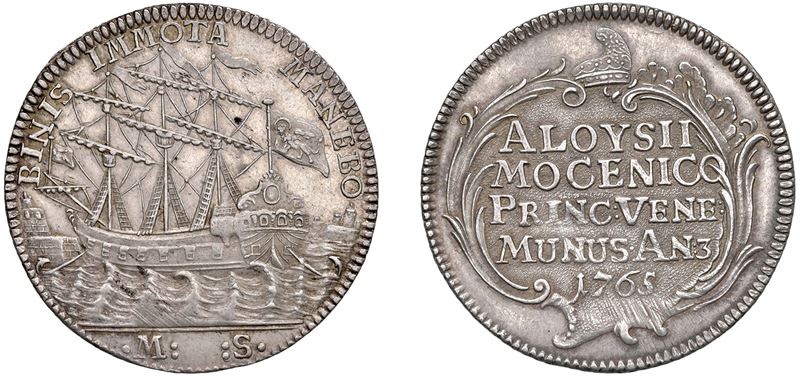 Diritto: Nave da guerra veneziana ancorata a prua, in basso sigle M S (Mario Soranzo, massaro); - Rovescio: Iscrizione su cinque righe orizzontali entro due tralci di fogliami chiusi in basso da una voluta ornamentale e in alto dal corno dogale.