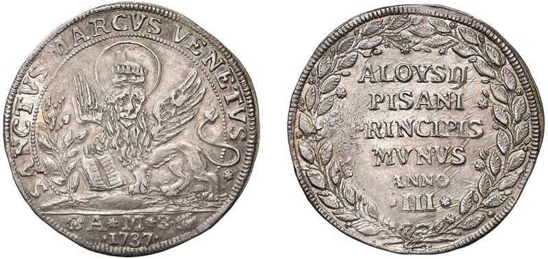 Dritto: Leone di San Marco alato e nimbato con corona e corno ducale, verso sinistra, con Vangelo tra le zampe anteriori. All'esergo sigle A M 3 (Angelo Memo, terzo massaro); - Rovescio: Iscrizione in sei righe racchiusa in una corona d'alloro.