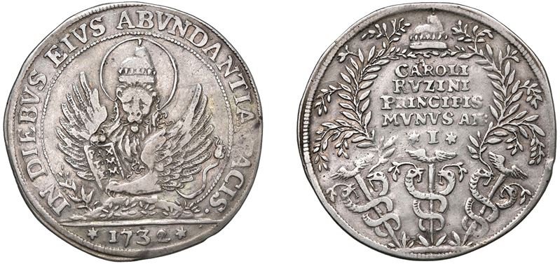 Dritto: Leone di San Marco alato e nimbato con corona e corno ducale, seduto con Vangelo tra le zampe; - Rovescio: iscrizione in cinque righe coronata dal corno dogale e due rami. Sotto la scritta spuntano tre caducei.