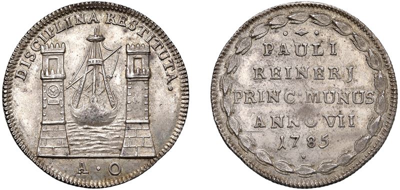 Dritto: Le due torri d'ingresso all'Arsenale di Venezia; fra di esse, una nave in procinto di passare; in esergo, sigle A O (Angelo Orlo, massaro); - Rovescio: Iscrizione in cinque righe entro corona d'alloro.