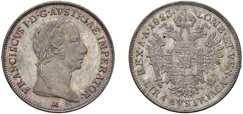 Diritto: Testa laureata a destra; - Rovescio: aquila bicipite coronata con stemma coronato del Lombardo Veneto e caricato al centro dello scudetto d'Austria, attorno Collare del Toson d'oro.