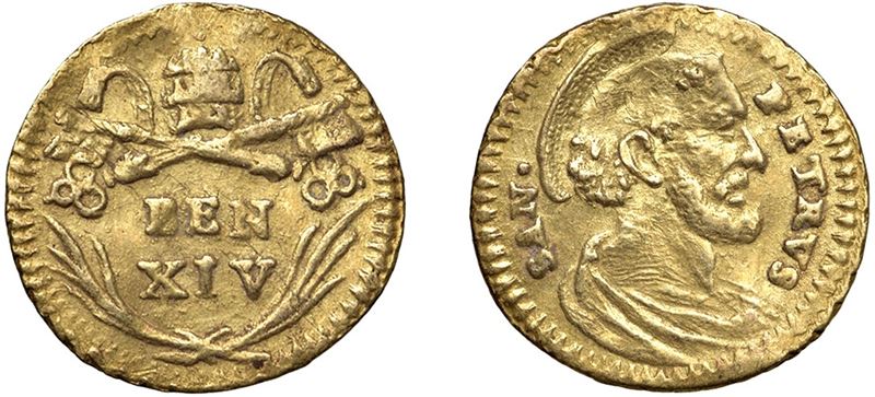Dritto: Iscrizione sormontata da triregno e chiavi decussate con impugnatura a tre anelli; in basso, due palme decussate; - Rovescio: Busto di San Pietro a destra con nimbo pieno.