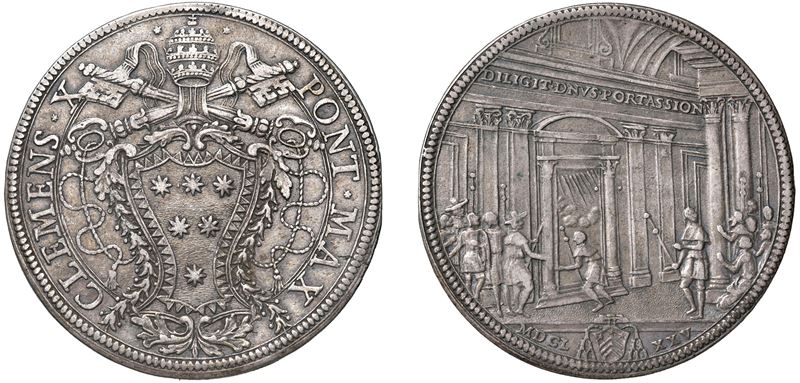 Dritto: Stemma poligonale oblungo con triangoli in rilievo, due festoni scendenti ai lati, fogliami sopra e sotto, sormontato da triregno e chiavi decussate con cordone attorcigliato e fiocco; - Rovescio: Portico della Basilica Vaticana veduto in parte di scorcio; nel mezzo la porta santa con raggi e nubi nell'interno, due colonne ai lati che sorreggono la cimasa a centina e due coppie di pilastri sulla parete; un pellegrino con bordone sta per entrare nella porta e due gruppi si avviano anch'essi, uno a sinistra di cinque pellegrini e uno a destra di sette. In basso stemma del Presidente di zecca Mons. Giovanni Battista Costaguti.