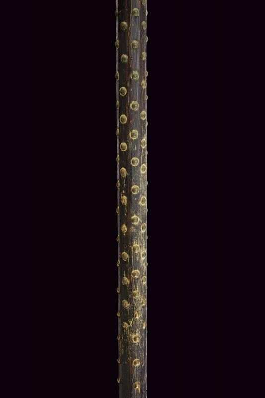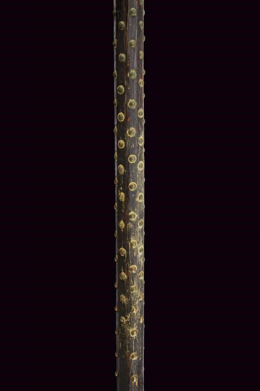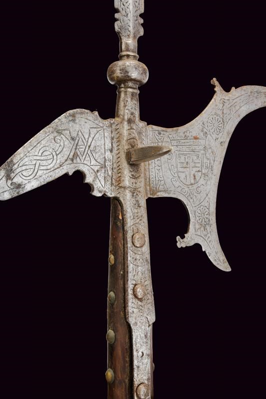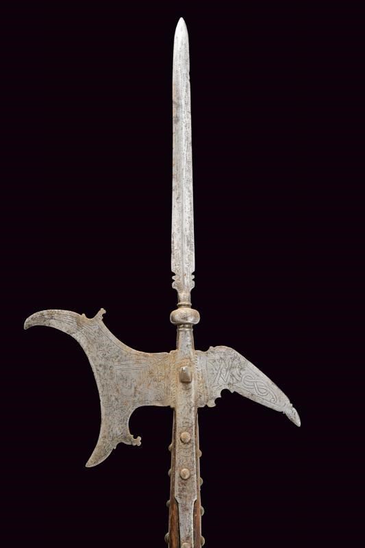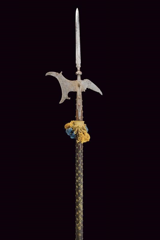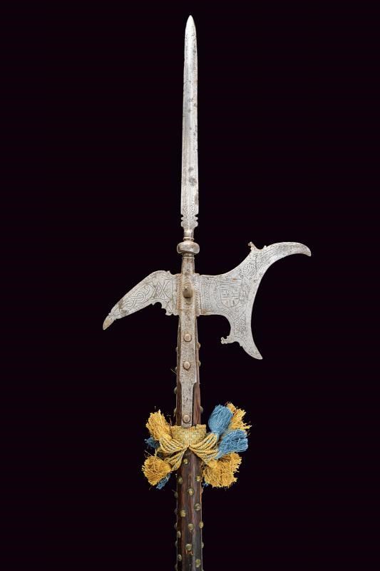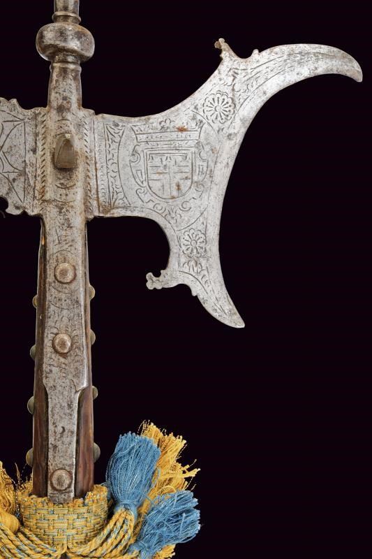 Cuspide a lama dritta a due fili, a sezione di losanga, con resti di incisioni, collo rastremato e nodo a cuscino alla base. Scure incavata con gobbe a becchetto, becco di falco quasi dritto con punta sagomata. Bandelle tronche. La superficie con resti di incisioni. Su cuspide sommitale e scure, rosette e altre decorazioni floreali, al centro del collo della scure emblema gentilizio con scudo a cartoccio caricato con croce (sabauda?) brisata di lambello ereditario e sormontata da corona (marchionale?). Sul becco il monogramma "VA" (Vittorio Amedeo?) e affiancato dal nodo sabaudo. Un arresto a brocco perpendicolare su entrambe le facce dell'alabarda. Su asta lignea di produzione più tarda ma non recente, decorata nel segmento superiore con borchiette in ottone e con nappe in tessuto dorato e azzurro. Interessante.
