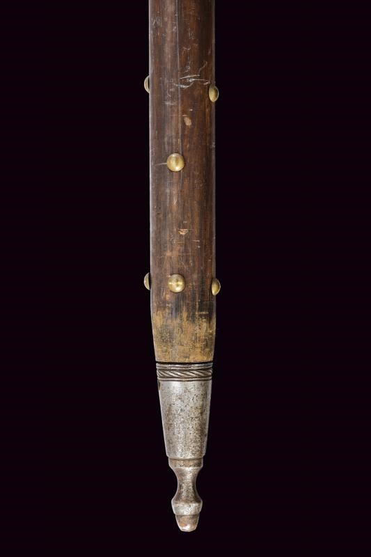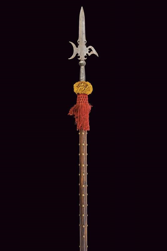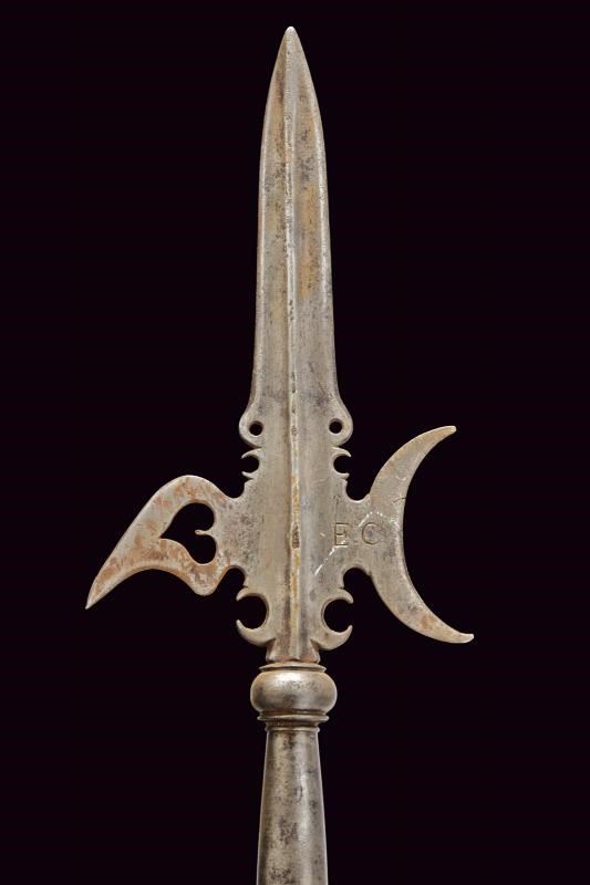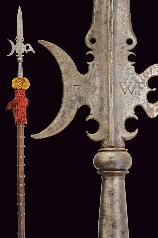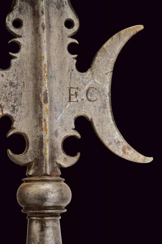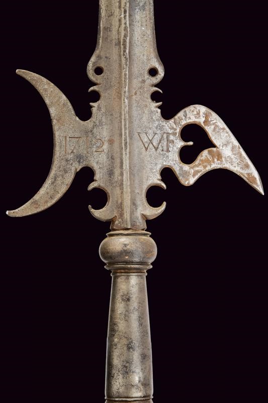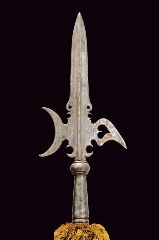 Cuspide a lama a due fili e nervata al centro, dotata di lobi traforati alla base e piccoli arresti, scuricina a falce di luna, becco incurvato verso il basso e dotato di traforo a cuore, altri piccoli arresti a mezzelune alla base, prima del nodo. La gorbia troncoconica, con bandelle molto brevi o troncate (coperte da nappine, non visibili). La scure marcata "EC" sul lato anteriore, "1712" e "WF" su quello posteriore. Asta lignea di produzione assai più recente, di sezione tonda, ornata con borchiette in ottone, piede in ferro. Insegna di comando per ufficiali e sottufficiali delle armate d'epoca moderna.
