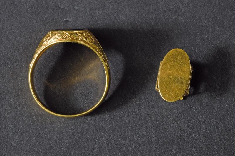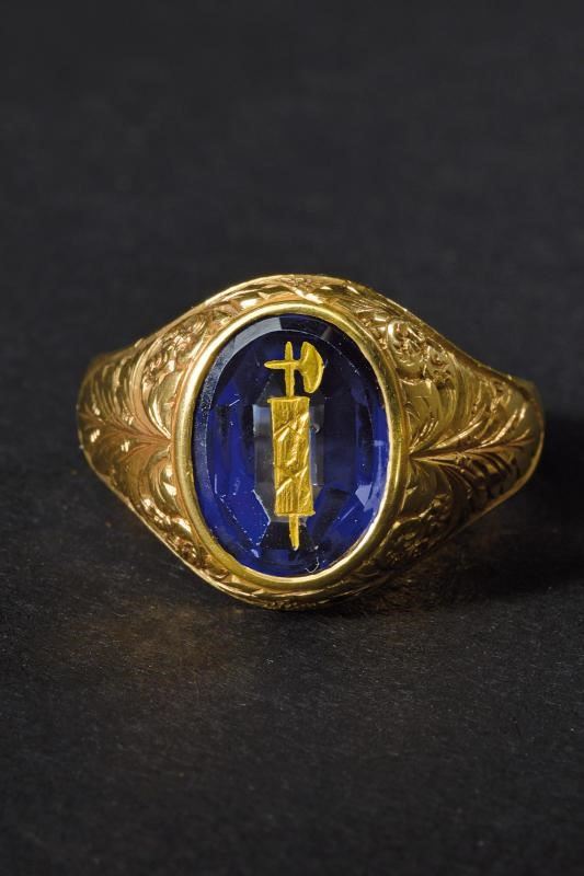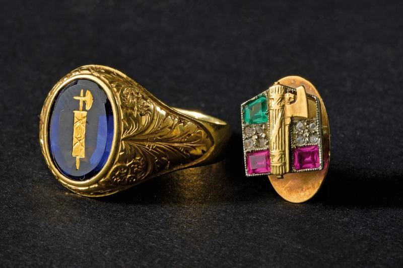 Anello in oro, inciso, con pietra dura viola recante al centro un fascio in oro; punzone “K 18”. Peso: 6 g. Spilla in oro con fascio sovrapposto a tricolore realizzato in smeraldo, diamanti e rubini. Peso: 2 g.