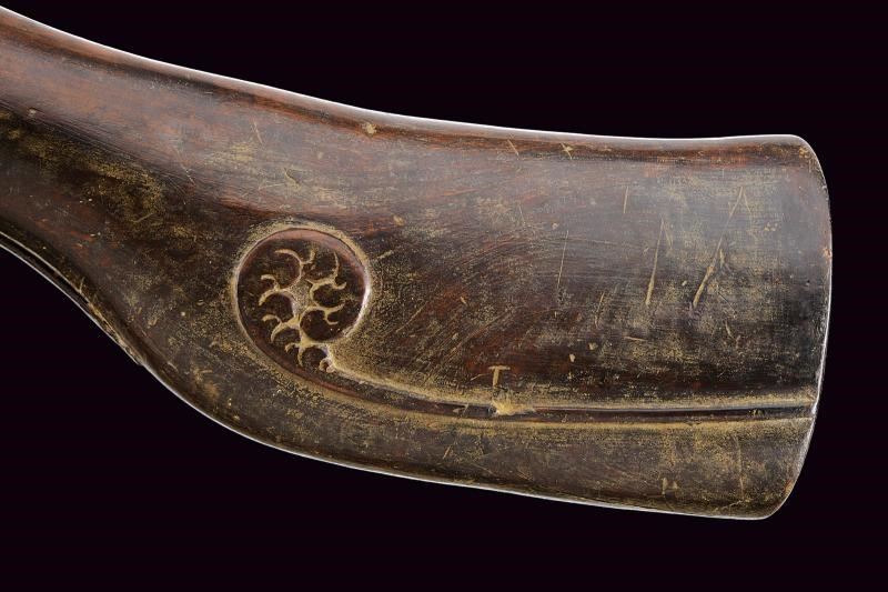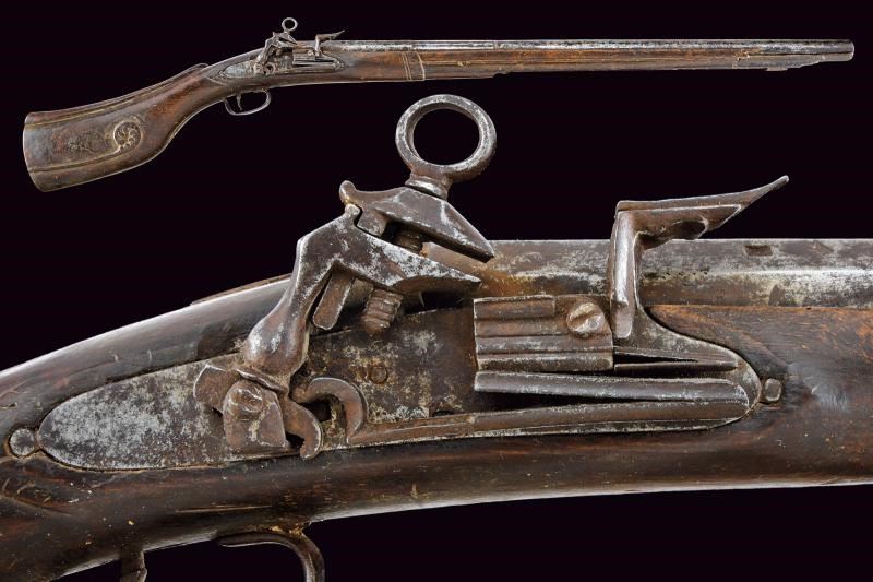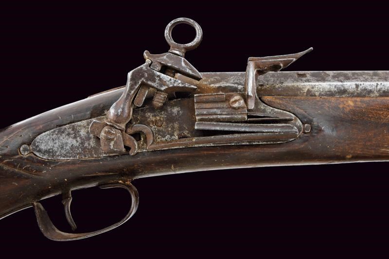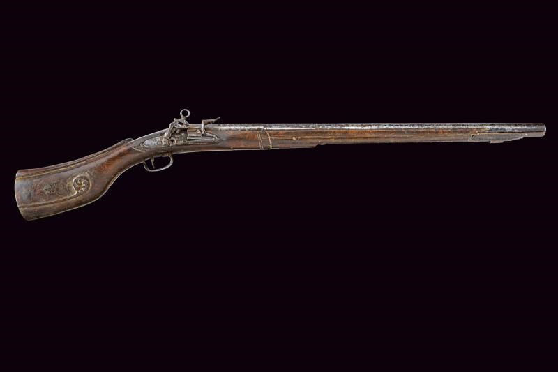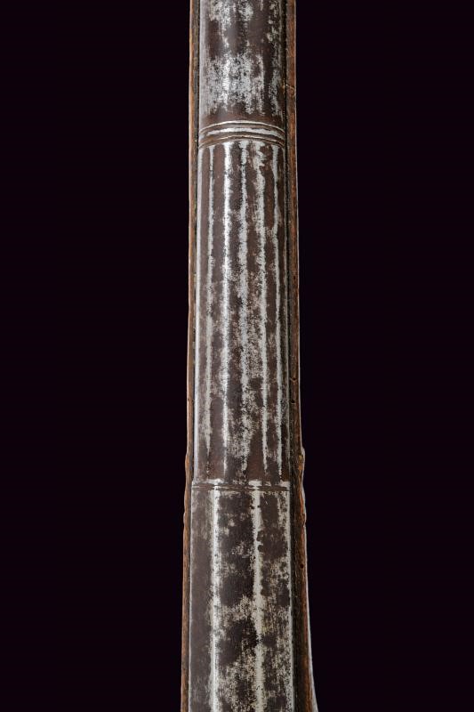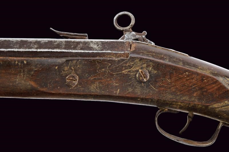Pesante canna liscia a tre ordini: la prima parte ottagonale con due punzoni, seguita da un segmento a sedici facce e da uno tondo; calibro 18 mm. Codetta liscia in due pezzi. Grande batteria alla romana. Cassa intera in legno (con mancanze, soprattutto ai lati, presso la volata) con calcio leggermente incurvato e scolpito. Ponticello in ferro liscio. Bacchetta mancante.
