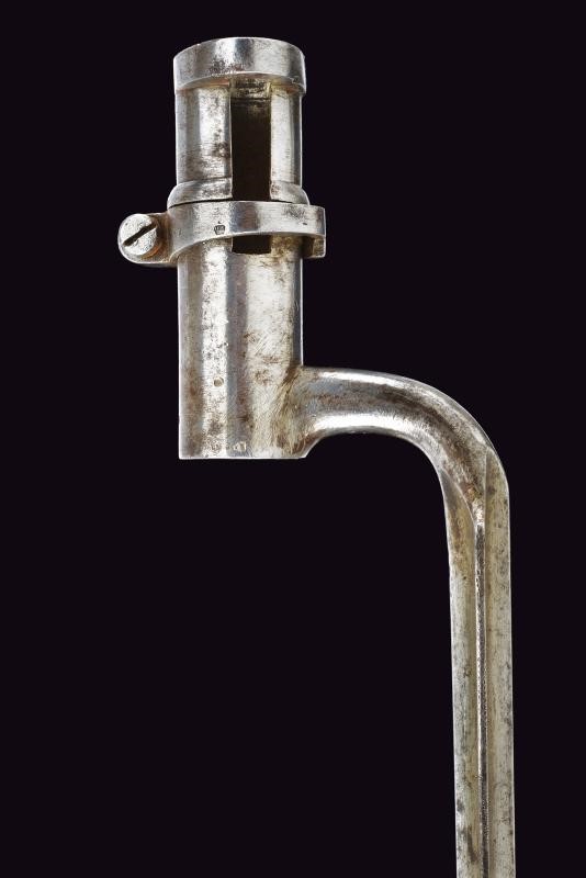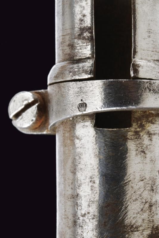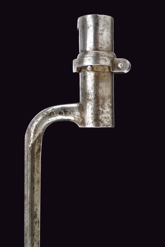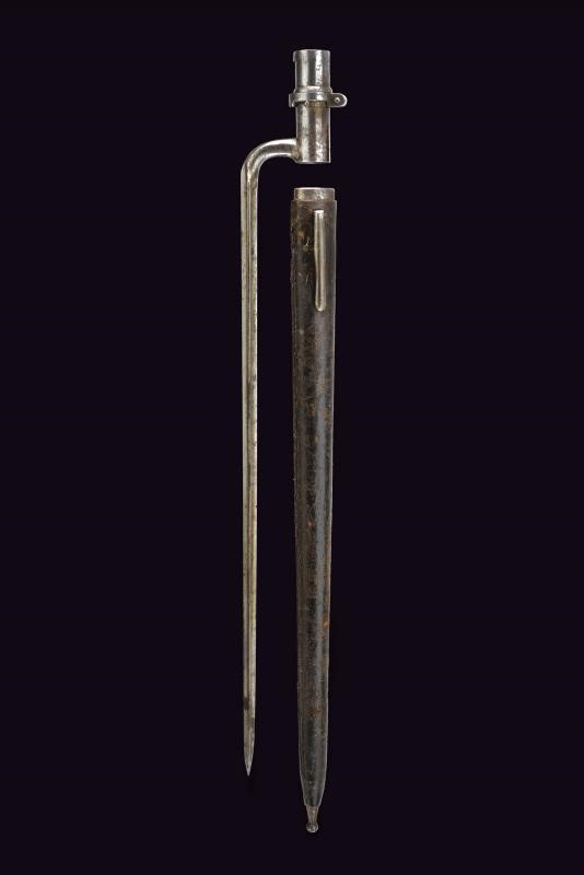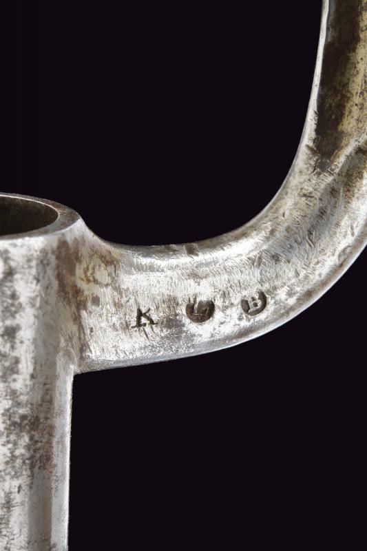 In ferro con lama cruciforme marcata con punzone "B" e altri punzoni. Fodero in cuoio con fornimenti e gancio in ferro.