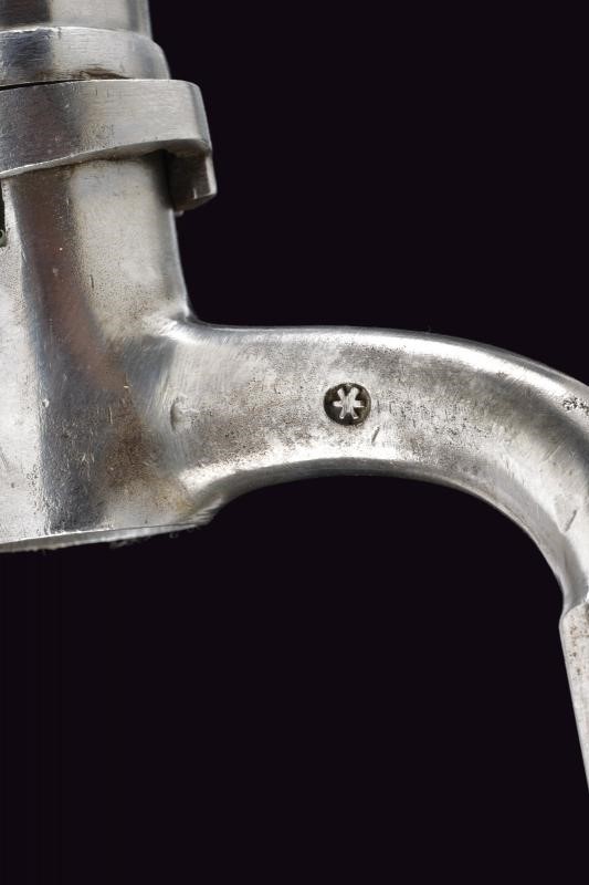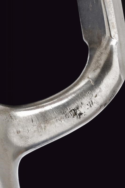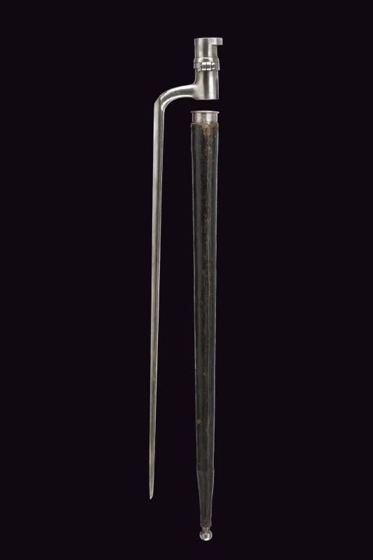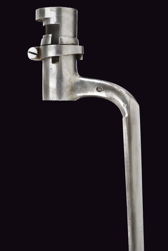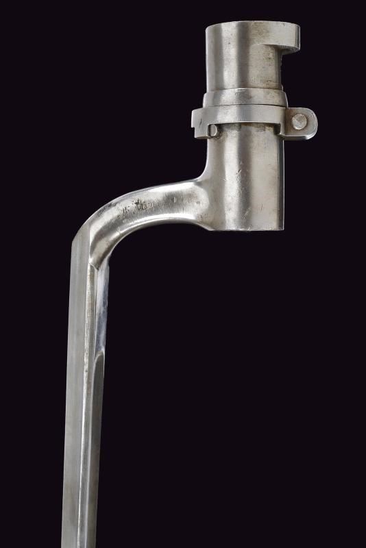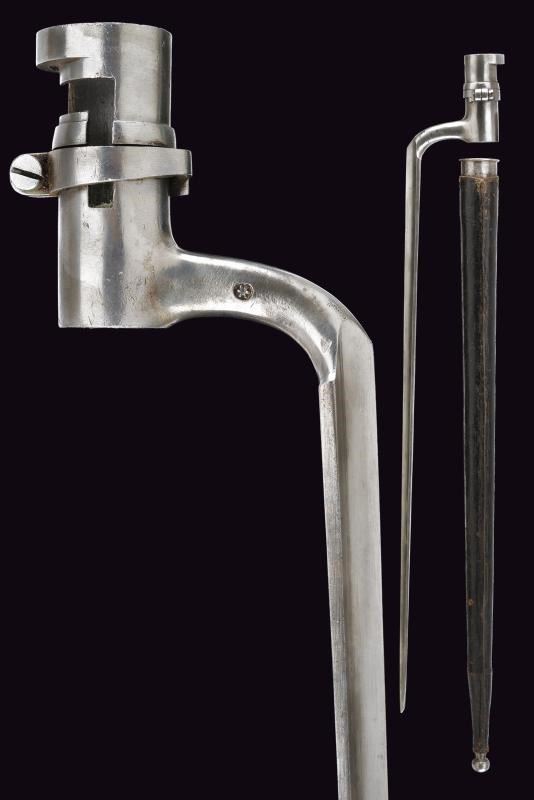 In ferro, con lama triangolare recante punzone imperiale. Riutilizzo di preda bellica, con fodero particolare rivestito in cuoio, dotato di fornimenti e gancio in ferro. Si abbina al fucile n. 52 di quest'asta.