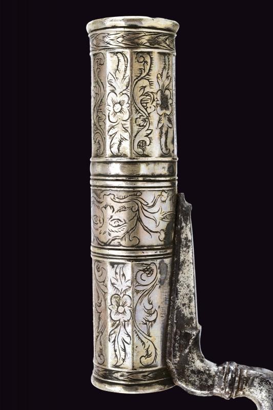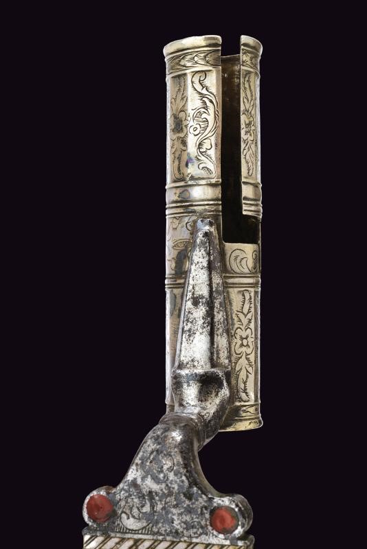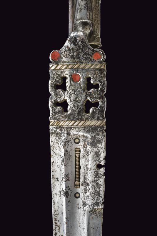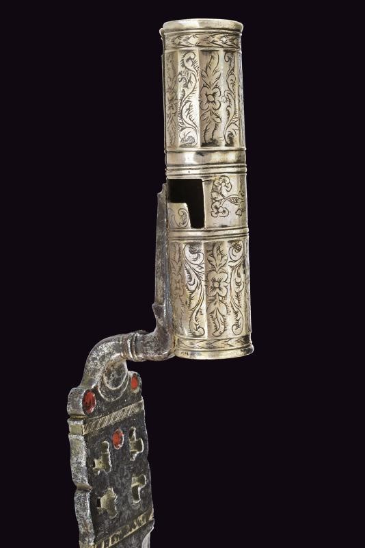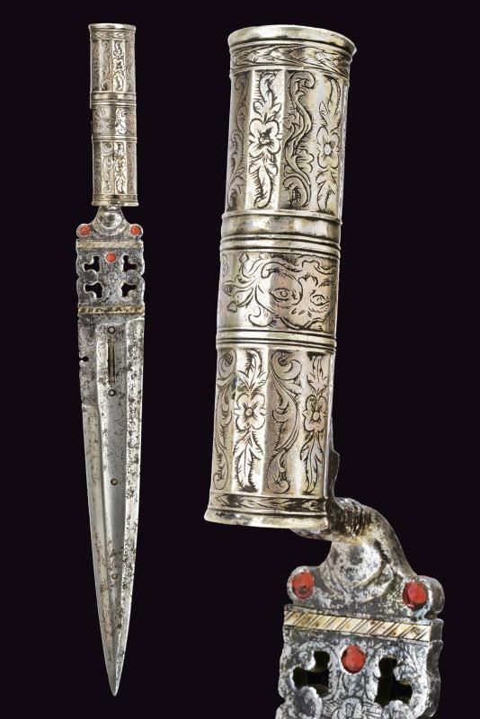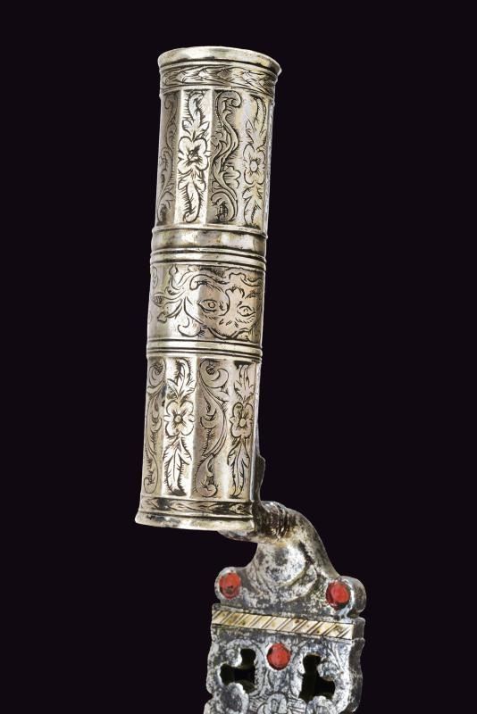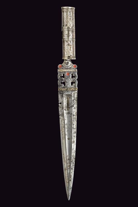 Bella lama diritta di forma triangolare, a un filo e controfilo, provvista di sguscio e decorazioni in ottone applicato. Tallone intagliato, inciso e traforato, parzialmente decorato con smalto rosso. Manicotto in argento, sfaccettato e inciso a motivi floreali.